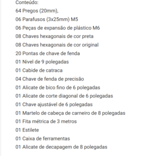 64 Pregos (20mm), 06 Parafusos (3x25mm) M5 06 Peças de expansão de plástico M6 08 Chaves hexagonais de cor preta 08 Chaves hexagonais de cor original 20 Pontas de chave de fenda 01 Nivel de 9 polegadas 01 Cabide de catraca 04 Chave de fenda de precisão 01 Alicate de bico fino de 6 polegadas 01 Alicate de corte diagonal de 6 polegadas 01 Chave ajustável de 6 polegadas 01 Martelo de cabeça de carneiro de 8 polegadas 01 Fita métrica de 3 metros 01 Estilete 01 Caixa de ferramentas 01 Alicate de decapagem de 8 polegadas